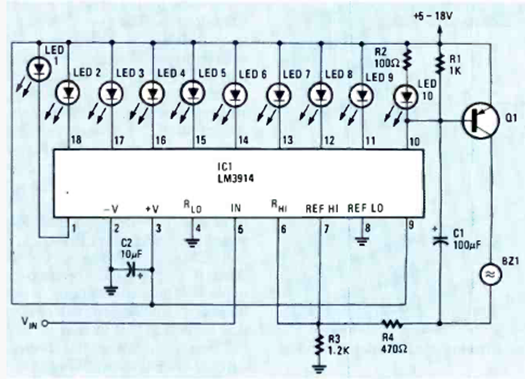 En la figura tenemos la forma de implementar un zumbador de alarma en un LM3914 para avisar sobre el cruce del límite de escala. El circuito puede utilizar otros tipos de advertencia.