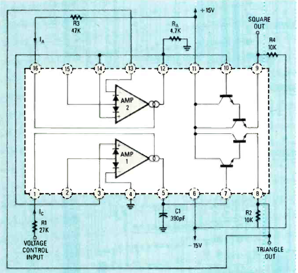 Encontramos este circuito en la edición de julio de 1988 de la revista Radio Electronics. Las frecuencias las proporciona el capacitor. C1 y la entrada de tensión se realiza en el pino 1.