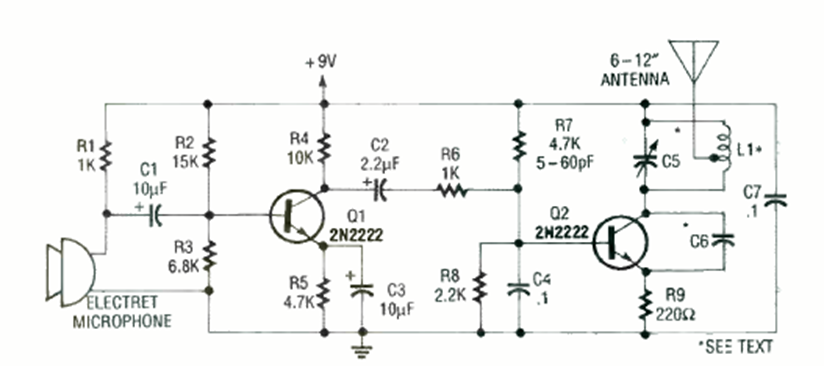 Este sencillo transmisor FM de dos transistores se encontró en la edición de noviembre de 1991 de la revista Radio Electronics. El circuito tiene una bobina de 2+2 vueltas de alambre sin forma de calibre 28 con un diámetro de 1 cm.