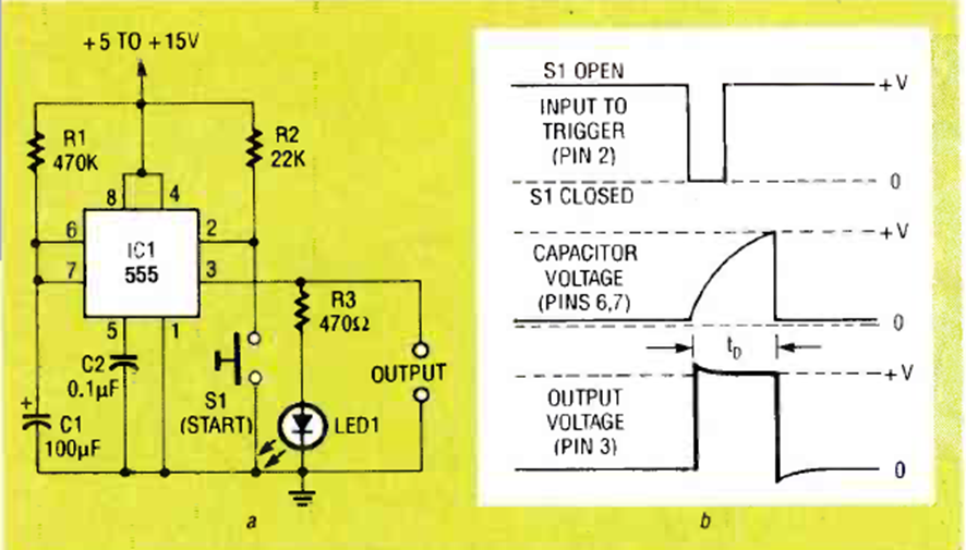 En un artículo de Radio Electronics de septiembre de 1992 encontramos este circuito básico 555 utilizado para generar tiempos fijos. El capacitor C1 y la resistencia R1 determinan el tiempo. El circuito controla un LED.
