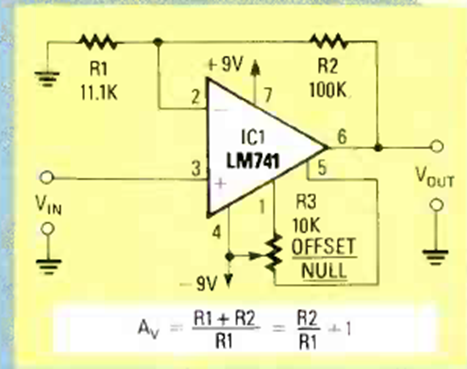 Este circuito tiene ganancia 10 para señales de CC. El circuito es de una Radio Electrónica de mayo de 1989. La fuente de alimentación debe ser simétrica.