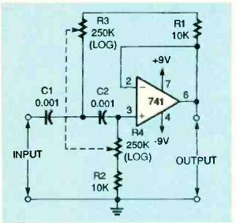 Este filtro de paso alto fue encontrado en la edición de febrero de 1996 de la revista Electronics Now. El circuito admite amplificadores operacionales equivalentes y la fuente debe ser simétrica.