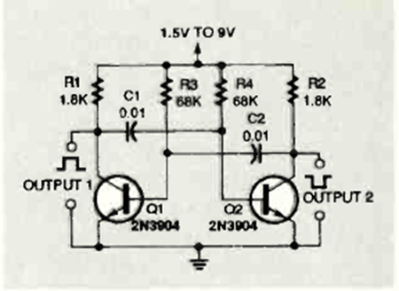 Este circuito genera una señal rectangular de 1 kHz de buena intensidad. El circuito es de la revista Electronics Now de marzo de 1996. Se puede utilizar cualquier transistor de propósito general.