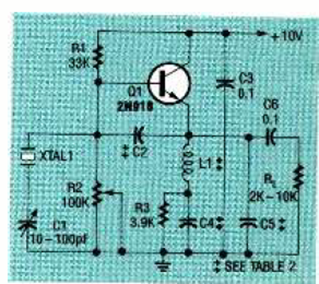 Este oscilador de cristal utiliza un transistor común y su frecuencia depende del cristal utilizado. Lo encontramos en la revista Radio Electronics de febrero de 1993.