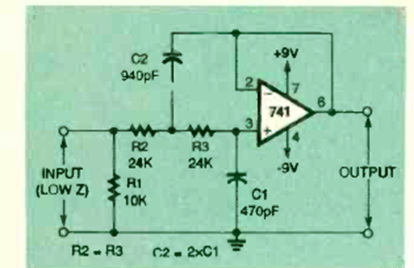 Este circuito de ganancia unitaria se encontró en la revista Electronics Now de febrero de 1995. La frecuencia es de 10 kHz y la alimentación debe ser simétrica.