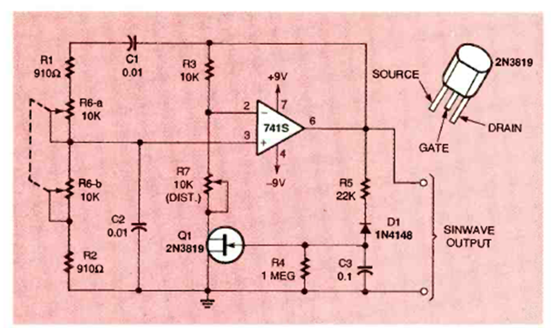 Este oscilador sinusoidal, que opera en el rango de 1,5 a 15 kHz, se basa en un operacional 741. El circuito es de una revista Electronics Now de diciembre de 1995.