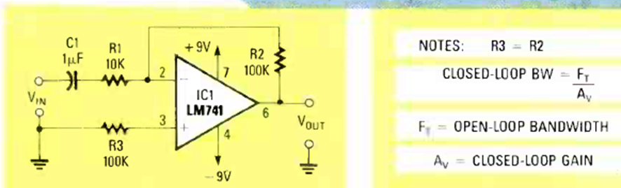 El circuito de la figura es un amplificador con ganancia 10 para señales alternas que utiliza el 741. El circuito es de un artículo de la revista Radio Electronics de mayo de 1989.