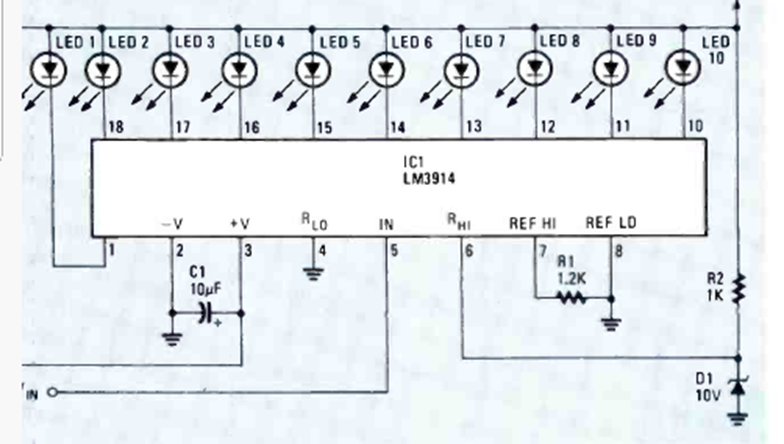 En la figura tenemos la forma de utilizar el Bargraph LM3914 con una fuente de voltaje de referencia externa. La referencia no puede ser mayor que la tensión de alimentación.