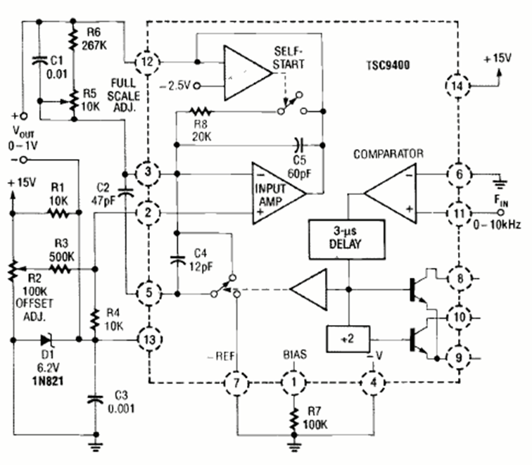 Este circuito convierte señales de 0 a 19 kHz a tensiones de 0 a 1 V. El circuito es de una revista de Radio Electronics de junio de 1991. Los componentes se pueden cambiar para otros rangos de frecuencia.