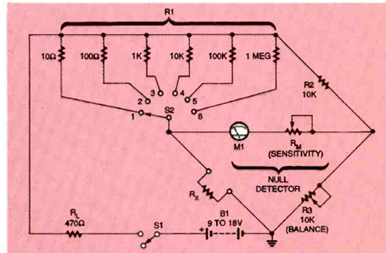 Encontramos este circuito puente en la edición de septiembre de 1995 de la revista Electronics Now. El instrumento puede ser de 50 uA a 1 mA. El valor del trimpot depende de este instrumento.