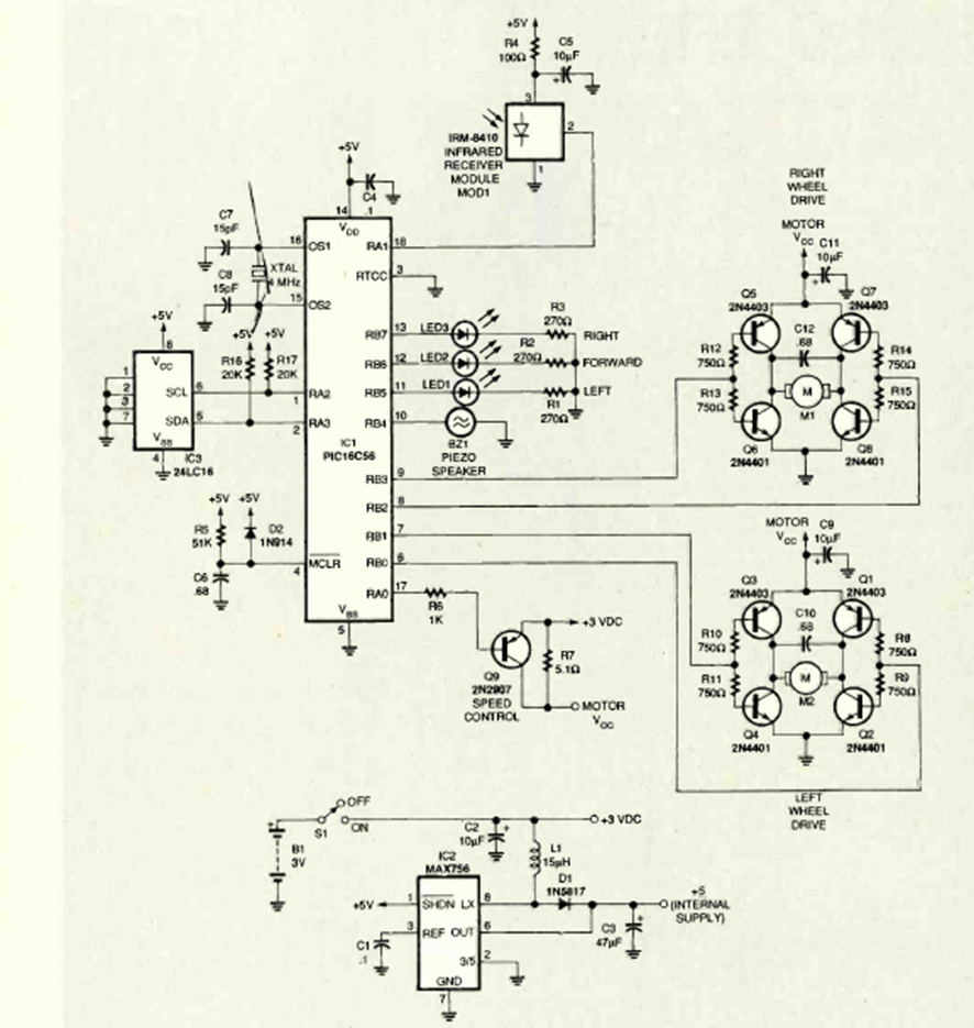 Este circuito es de un proyecto publicado en la revista Electronics Now de marzo de 1996. El autor utilizó un control remoto común para tener 17 funciones en un robot común.