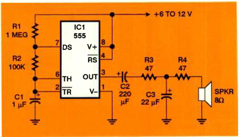 Este circuito imita el latido del corazón con el sonido más suave reproducido a través de un pequeño altavoz. El circuito es de Electronics Now de enero de 1997.