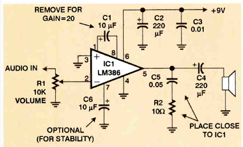 En el diagrama de la revista Electronics Now de noviembre de 1999 tenemos la forma de mejorar tanto la ganancia como la estabilidad del amplificador LM386.
