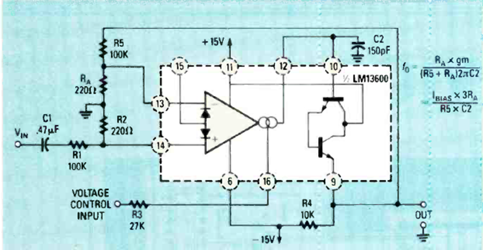 Este circuito, basado en un LM36000 OTA, se encontró en la edición de julio de 1988 de la revista Radio Electronics. Cubre frecuencias en el rango de 45 Hz a 45 kHz.