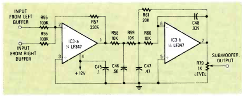 Este circuito de paso bajo se encontró en la edición de diciembre de 1990 de la revista Radio Electronics. El circuito es parte de un sistema de sonido de cine en casa.