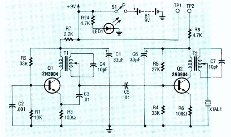 Este circuito se encontró en una revista Radio Electronics de noviembre de 1991. El circuito funciona a 2,2 MHz y tiene una salida de baja impedancia.
