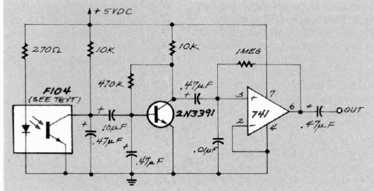 Este circuito sensor de latidos se encontró en la edición de julio de 1992 de la revista Radio Electronics. El circuito utiliza un 741 con una fuente de alimentación sencilla.