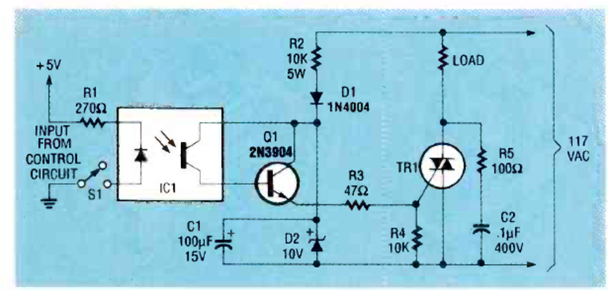Este circuito aislado no sincronizado con triac y optoacoplador fue encontrado en la revista Radio Electronics de agosto de 1992. El circuito se puede utilizar como blindaje.