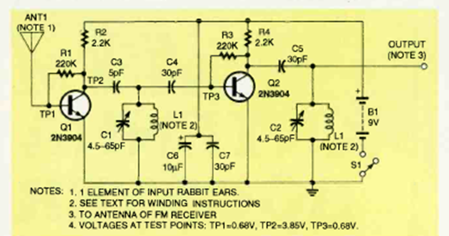 Este circuito sintonizable se encontró en la edición de mayo de 1994 de la revista Electronics Now. El circuito cuenta con dos etapas de amplificación y una excelente ganancia.
