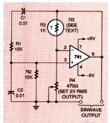 Encontramos este oscilador de onda sinusoidal en la edición de diciembre de 1995 de la revista Electronics Now. El circuito utiliza un 741 y está alimentado por una fuente simétrica.