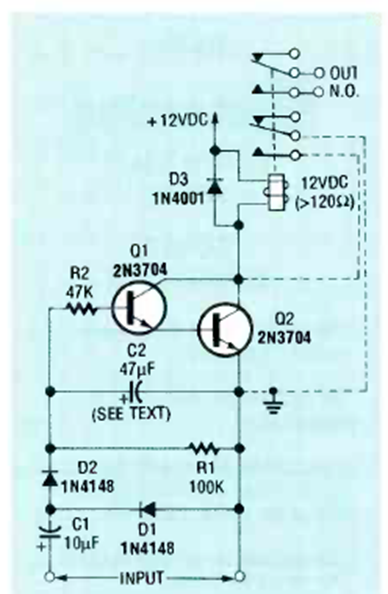 Este circuito permite detectar señales alternas que son demasiado débiles para activar un relé. El circuito es de una Radio Electronics de julio de 1990.