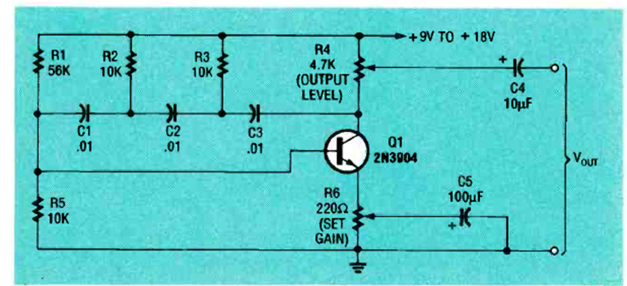 En este circuito de cambio de fase, el transistor puede ser cualquier transistor de propósito general. El circuito es de Electronics Now de junio de 1993.