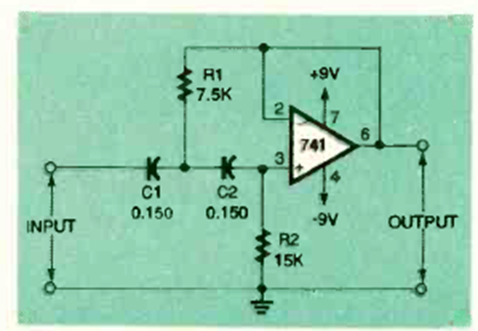 Utilizando un 741 op este circuito de paso alto a 10 kHz fue encontrado en la edición de febrero de 1995 de la revista Electronics Now. La fuente de alimentación debe ser simétrica.
