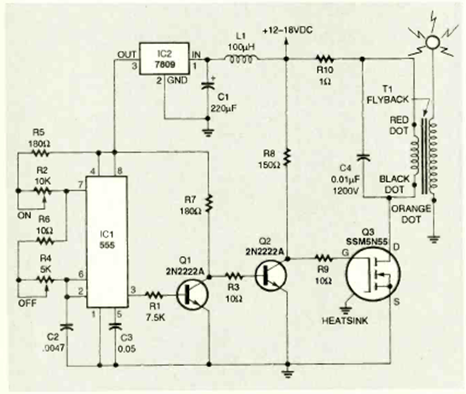 Esta bobina de Tesla fue encontrada en la edición de noviembre de 1994 de la revista Electronics Now. T1 es un transformador flyback de TV, pero también se puede utilizar una bobina de encendido de automóvil.