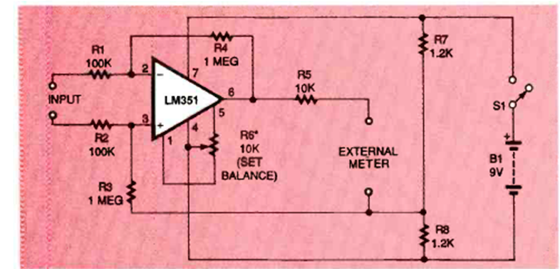 Este circuito se puede utilizar para medir puentes. Lo encontramos en la revista Electronics Now de septiembre de 1995. El medidor puede ser de 50 uA a 1 mA y la alimentación es sencilla.