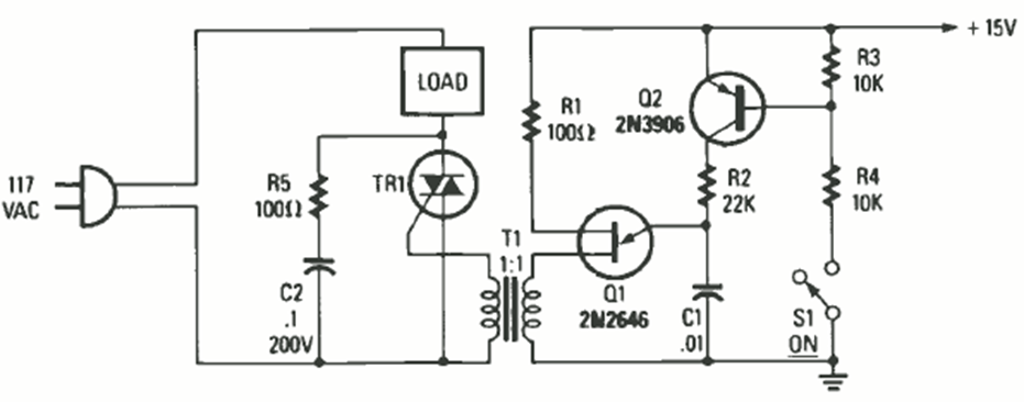 Este circuito triac se encontró en la revista Radio Electronics de octubre de 1987. El triac depende de la carga y debe montarse en un disipador de calor.