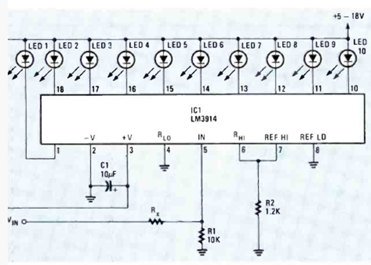 Este es el circuito básico a escala completa de un LM3914 para medición de voltaje o activación y control de tensión. La fuente de alimentación debe estar dentro del rango indicado.