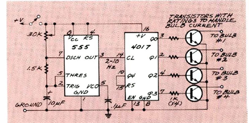 Este circuito convencional de 4 canales con el 4017 y el 555 fue encontrado en la revista Radio Electronics de noviembre de 1991. El potenciómetro puede ser de 47k y controla la velocidad del efecto.