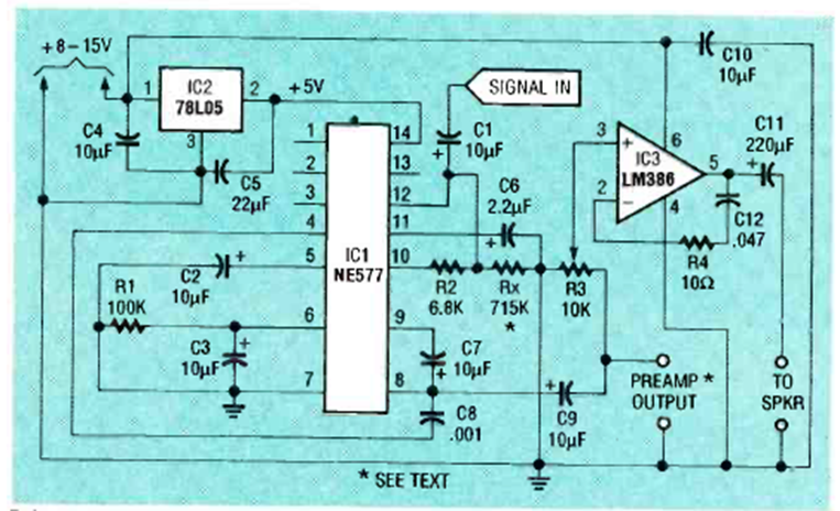 Encontramos este circuito en la revista Radio Elecronics de febrero de 1993. El circuito integrado principal es de esa época y la alimentación se realiza con tensiones de 6 a 15 V.