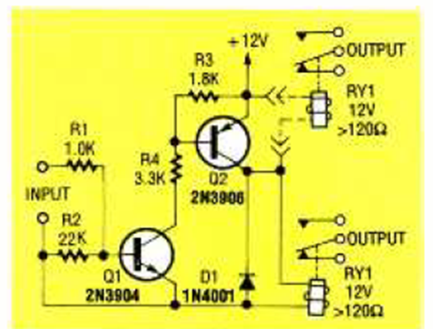 Este circuito solo necesita 0,7 V a 40 uA para activar el relé. Lo encontramos en la revista Electronics Now de noviembre de 1993. La tensión de alimentación depende del relé utilizado.