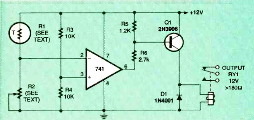 El circuito es de Electronics Now de junio de 1995. El relé depende de la potencia y tanto R1 como R2 deben tener resistencias similares en funcionamiento.