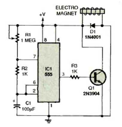 Este circuito genera campos magnéticos alternos en un pequeño electroimán para diversos experimentos. El circuito fue publicado en Electronics Now de noviembre de 1996 para experimentos con láser.
