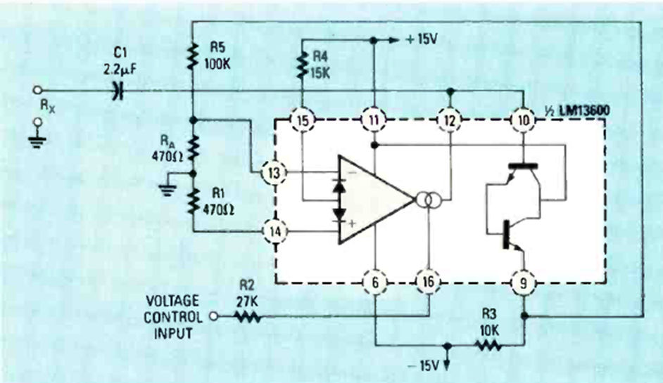 Este circuito se comporta como una resistencia controlada por voltaje y puede servir como una pequeña carga. El circuito es de una Radio Electronics de julio de 1988.