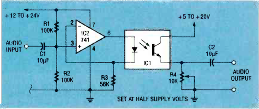 Este circuito de aislamiento para señales de audio se encontró en la edición de agosto de 1992 de la revista Radio Electronics. El circuito puede aplicarse a otros amplificadores operacionales.