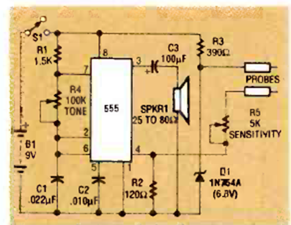 Esta sencilla prueba del componente 555 se encontró en la edición de noviembre de 1992 de la revista Radio Electronics. El circuito se alimenta con baterías de 6 a 12 V.