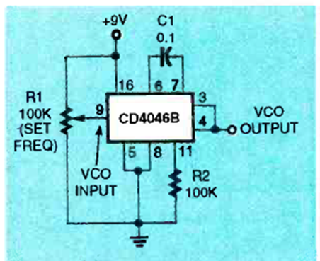 El PLL 4046 es poco común hoy en día. Este circuito fue encontrado en la edición de agosto de 1994 de la revista Electronics Now. Opera de 0 a 1,4 kHz con ajuste de tensión en el pin 9.