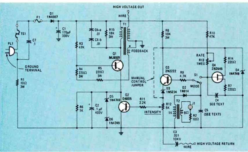 Esta es la conocida lámpara de rayos que fue publicada en la revista Saber Eletrômica en marzo de 1988. El transformador y un flyback de TV con núcleo de ferrita también constituyen el elemento oscilante del circuito. El circuito funcionaba a 20 kHz. El artículo proporcionó información sobre la lámpara y el transformador.
