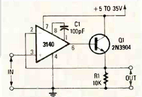 Este amplificador inversor tiene una etapa de salida de transistor que puede aumentar su capacidad de corriente. Se pueden utilizar transistores de mayor corriente.