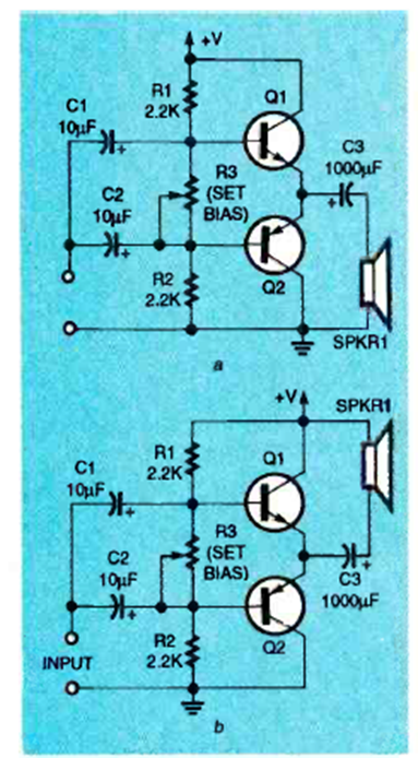 Sugeridos por la revista Electronics Now de abril de 1994, estos circuitos se pueden utilizar como etapas de salida de pequeños amplificadores de audio. Los transistores pueden ser de propósito general.