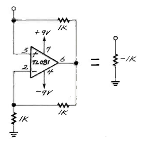 Este circuito que se encuentra en la revista Electronics Now emula una resistencia negativa de -1k. El circuito se puede utilizar en osciladores de relajación.