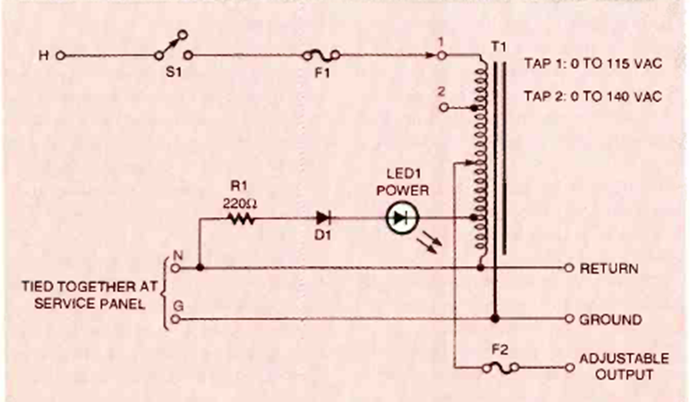 En la figura tenemos el circuito típico de un variac con un transformador especial con ajuste deslizante de las espiras del bobinado. El circuito es de una revista Electronics Now de diciembre de 1997.