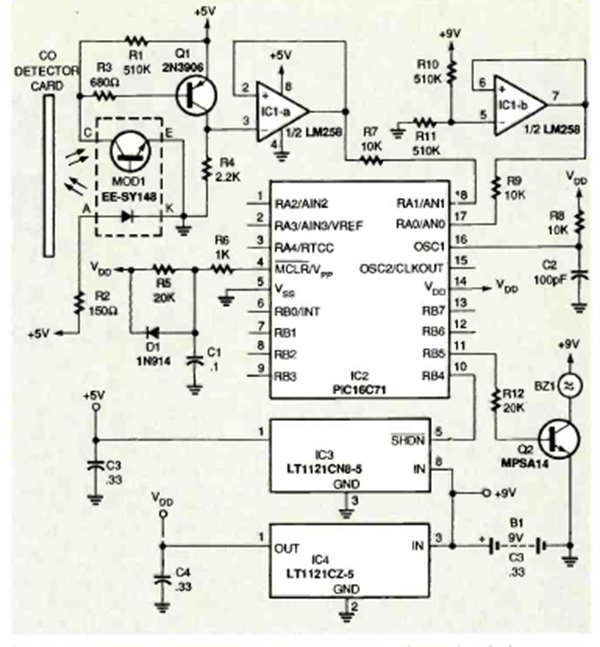 Este es un circuito antiguo con un sensor casero encontrado en la revista Electronics Now de septiembre de 1995. El circuito se basa en la transmisión de luz a través del aire que varía según la concentración del gas.