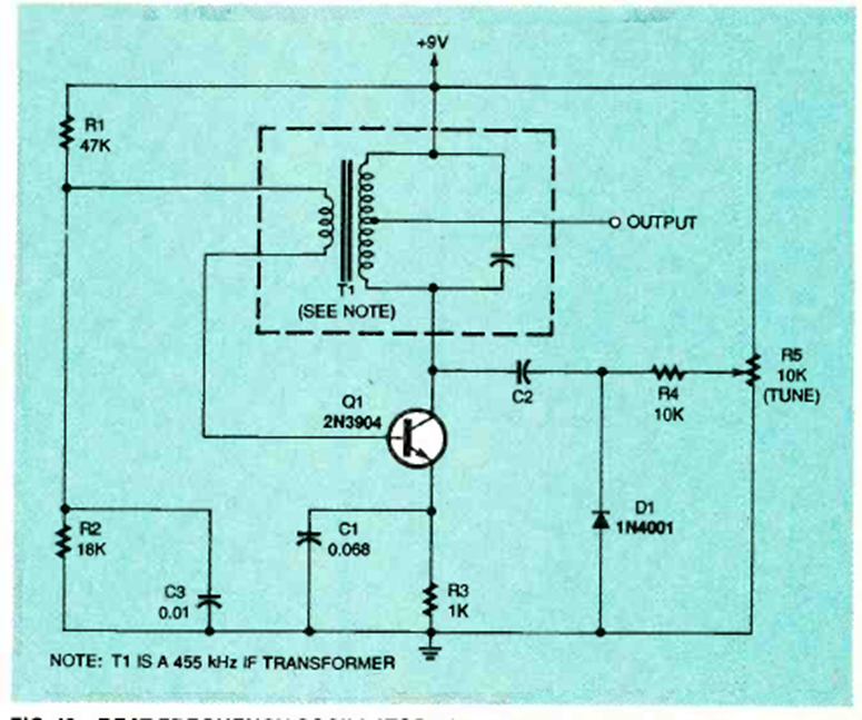 Este BFO u OFB para escuchar señales SSB (banda lateral única) fue encontrado en la revista Electronics Now de enero de 1996. La bobina es un transformador de FI con la frecuencia del receptor con el que se utilizará.