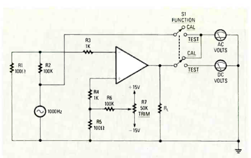 Este sencillo comprobador de amplificadores operacionales se publicó en la edición de noviembre de 1987 de la revista Radio Electronics. La fuente de alimentación debe ser adecuada para el amplificador operacional que se está probando.