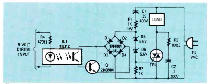 Este circuito es un excelente protector para microcontroladores y se encontró en la revista Radio Electronics de octubre de 1987. Se puede utilizar con otras tensiones, ya que el triac y el optoaislador admiten versiones más modernas.
