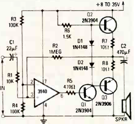 En la figura tenemos la forma de implementar una salida de potencia de audio para un operacional. Con los transistores utilizados tenemos una potencia del orden de unos cientos de miliwatts.